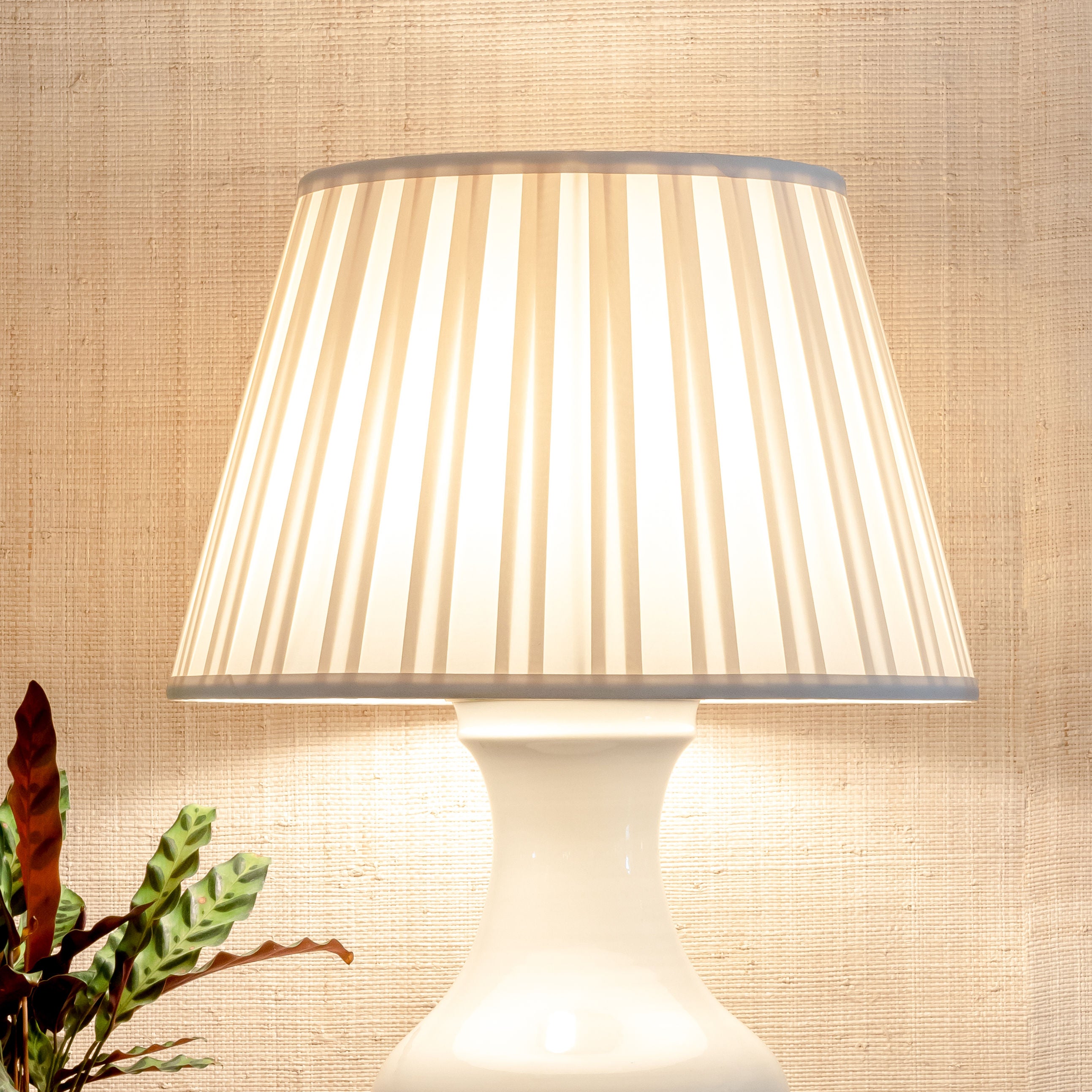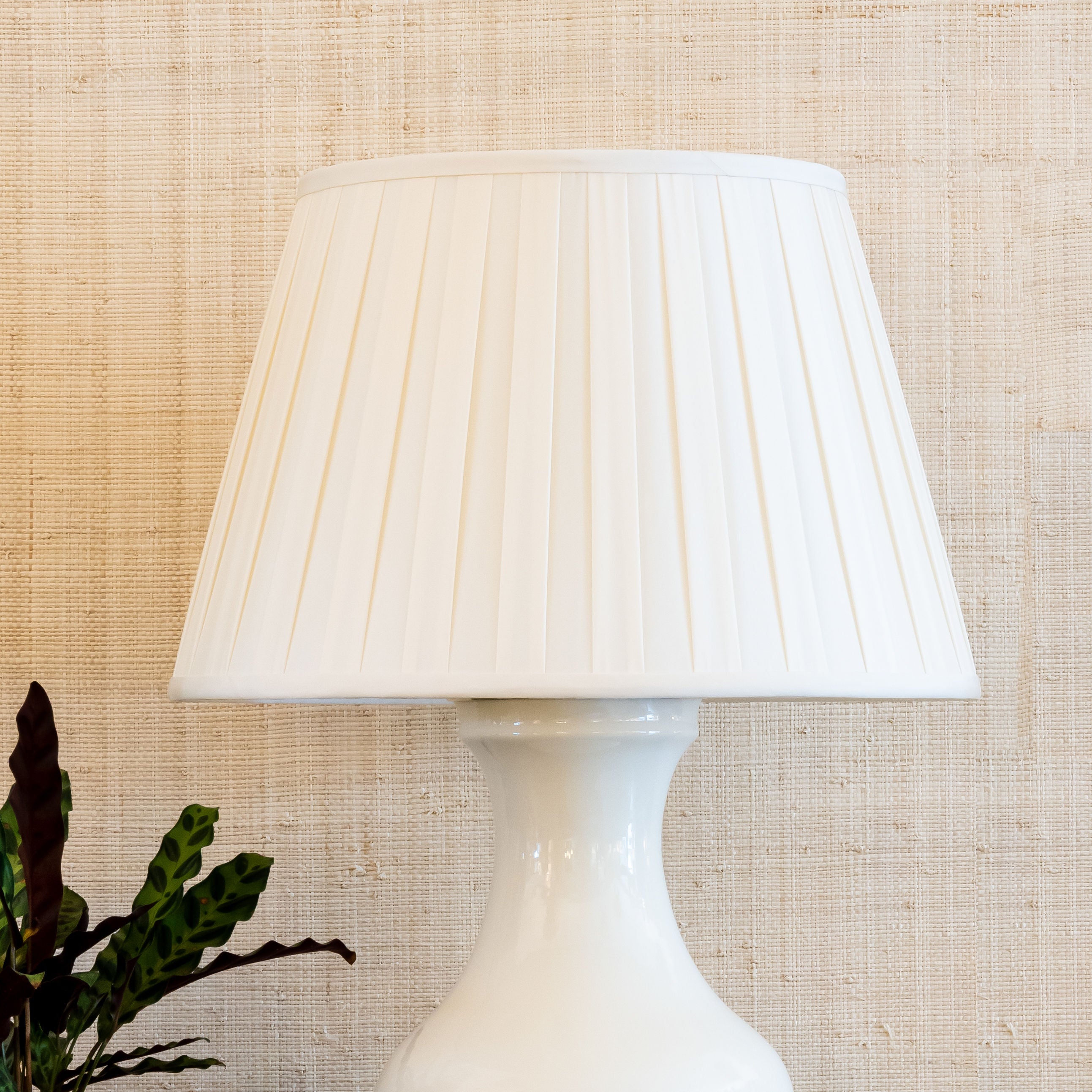 Remember, decorating has a lot to do with balance and contrast. Trying to let a textured lamp base shine? Opt for a something simple like a smooth paper or linen shade. Need to soften up the space? Try a gathered pleated shade in a warm tone.